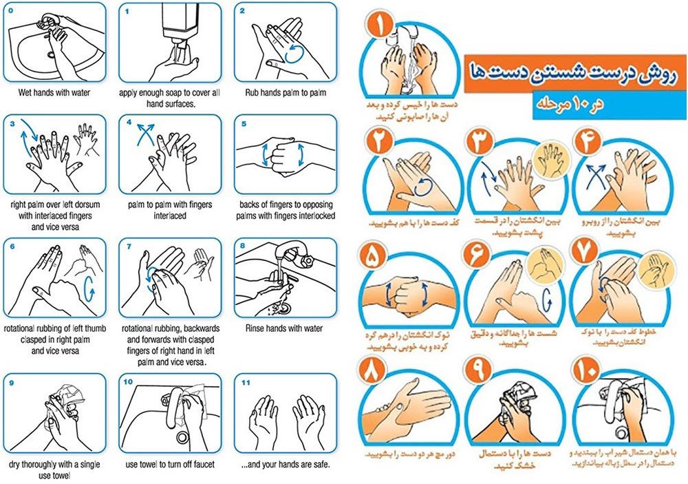 برای پیشگیری و جلوگیری از انتقال ویروس کرونا توصیه می شود به محض ورود به دندانپزشکی دست های خود را بشویید. برای شستشوی صحیح دست ها نیاز به آب گرم و صابون و ترجیحا صابون مایع می باشد. مراحل زیر را به ترتیب طی کنید: